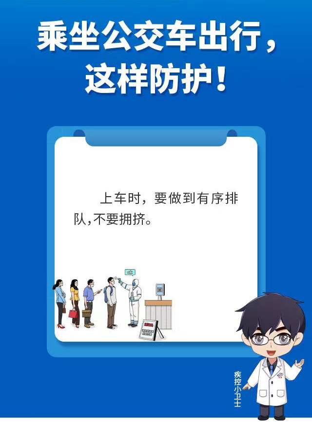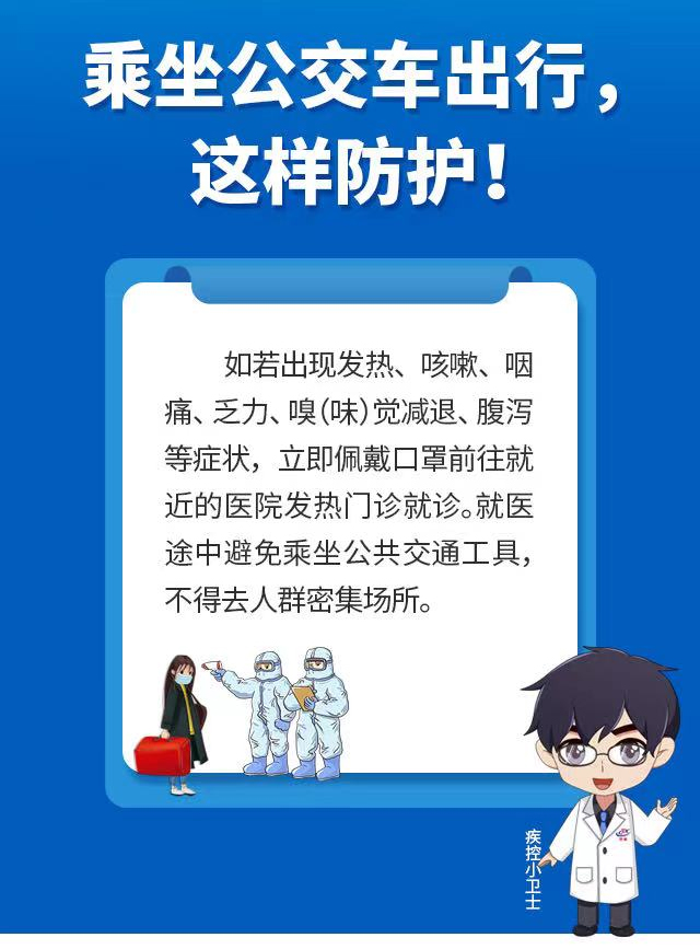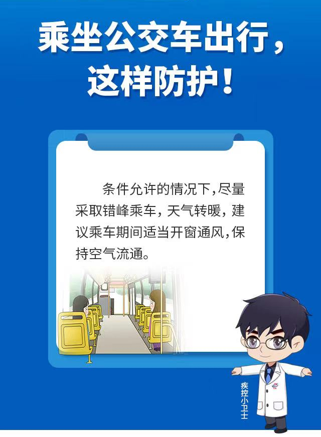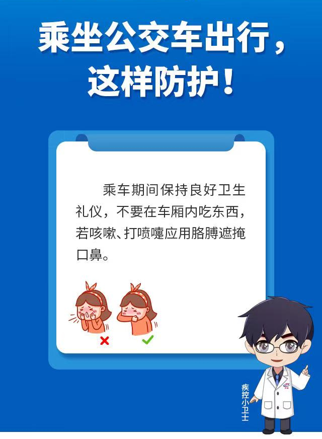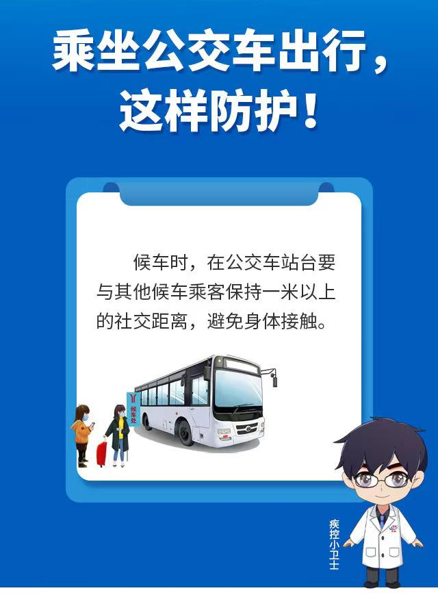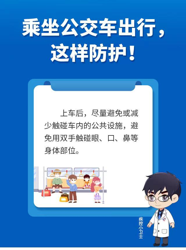 公交車是市民出行的重要公共交通工具,濟(jì)南市疾控中心提醒市民,在乘坐公交車出行時(shí),應(yīng)配合公交部門(mén)采取的疫情防控措施,全程規(guī)范佩戴口罩。還要做好以下幾點(diǎn)防護(hù):